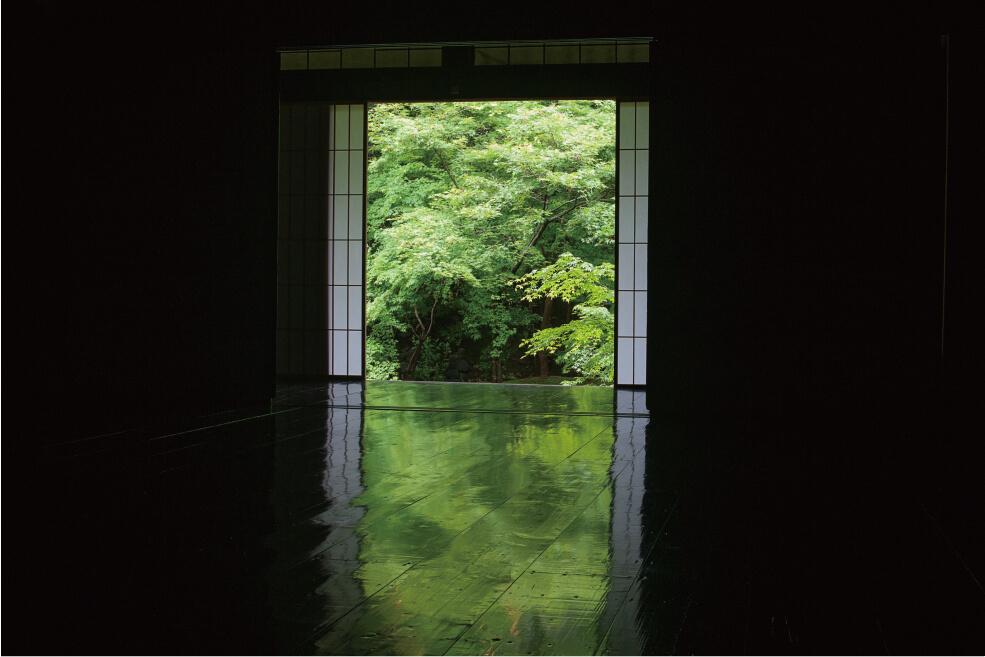 新緑の京都、青もみじの名所へご案内。実相院門跡では「滝の間」にある漆黒の床板に楓の木々が映り込む清々しい「床みどり」が味わえます。