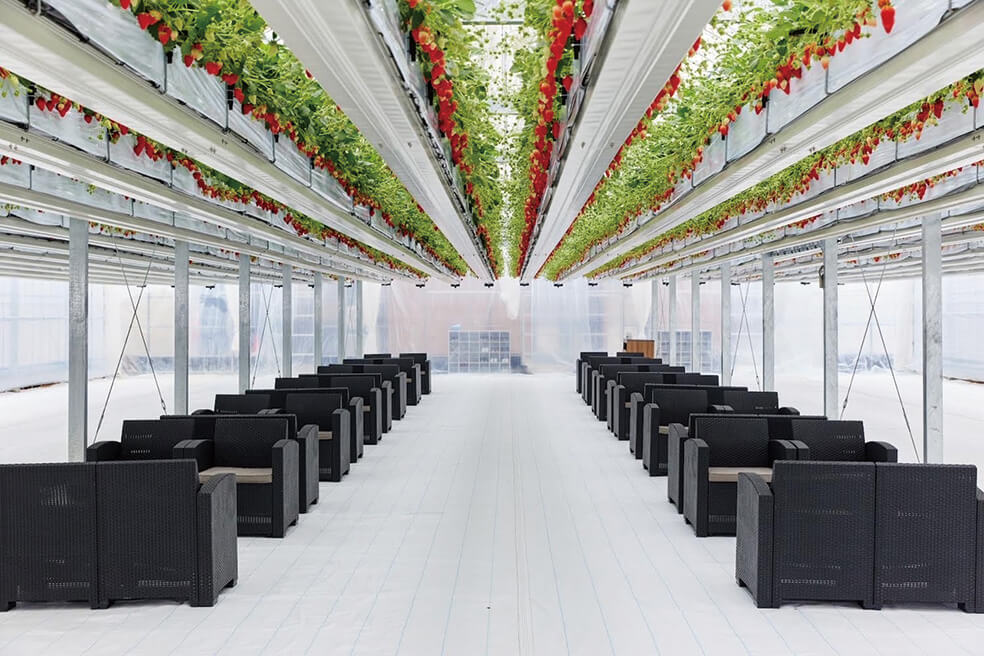 新しい形のいちご狩りが出来るいちご農園「アメリ」では、宙に浮かぶ無数のいちごを眺めながら、摘み取ったいちごとスイーツ・ドリンクで非日常的なカフェタイムをお楽しみください。