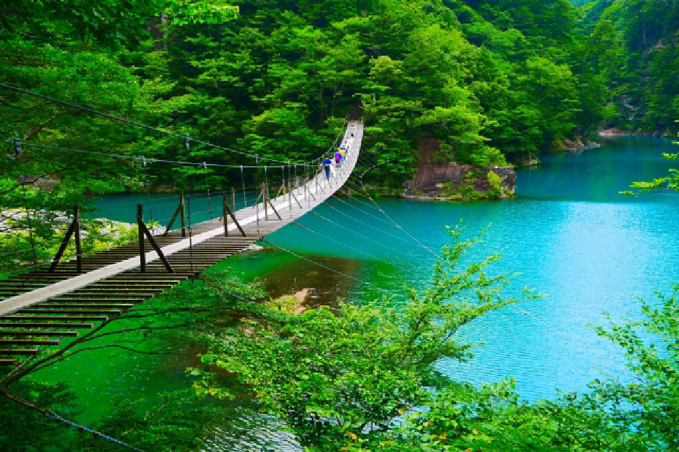 死ぬまでに渡りたい世界の吊り橋にも選ばれた寸又峡温泉『夢のつり橋』。ターコイズブルーの湖面に青々と茂る山々の風景が映り込み、絵画のような美しさを見せてくれます。